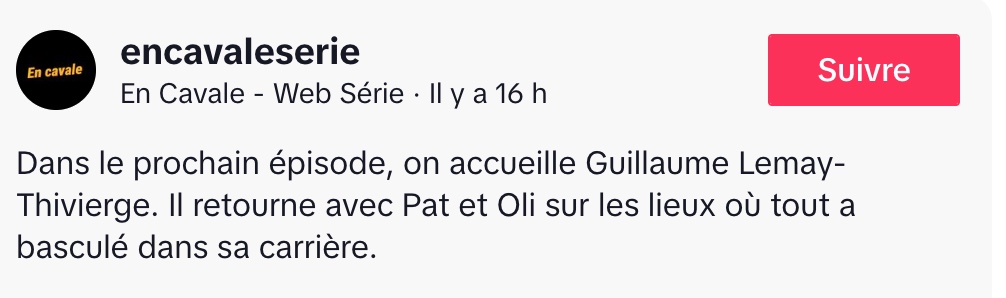 @encavaleserie Dans le prochain épisode, on accueille Guillaume Lemay-Thivierge. Il retourne avec Pat et Oli sur les lieux où tout a basculé dans sa carrière. #podcast #divertissement ♬ son original – En Cavale – Web Série