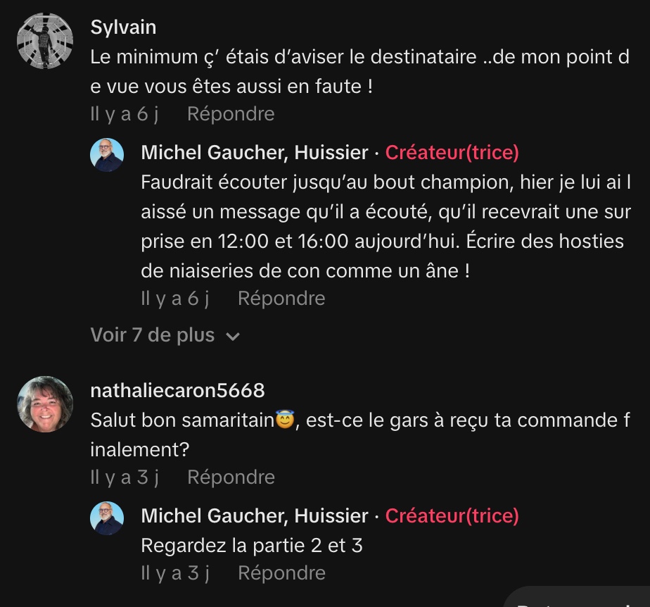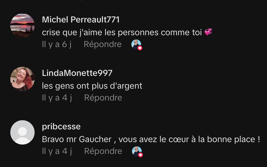 Sur TikTok, Michel Gaucher a livré une sortie coup de poing, empreinte de colère, mais surtout d’humanité. Dans sa vidéo, il raconte une intervention professionnelle à Contrecœur auprès d’un homme criblé de dettes, sans emploi, sans ressources et avec un enfant à charge. Touché par la misère qu’il constate sur le terrain, Michel explique qu’il n’a jamais cherché la reconnaissance publique pour ses gestes de générosité. Contrairement à ceux qui affichent leurs dons sur les réseaux sociaux, lui agit en silence.