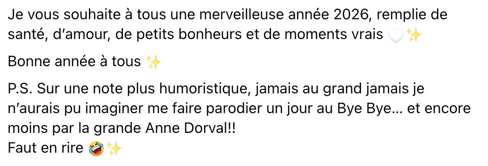 Elle termine son message avec reconnaissance envers les nombreuses personnes qui lui ont écrit tout au long de l’année, soulignant à quel point leurs mots bienveillants ont illuminé ses journées. Sur une note plus légère, Isabelle aborde sa réaction à la parodie dont elle a fait l’objet au Bye Bye. Surprise et amusée, elle avoue n’avoir jamais imaginé être parodiée, encore moins par Anne Dorval. Une situation inattendue qu’elle choisit d’accueillir avec humour et autodérision, prouvant une fois de plus sa capacité à rire d’elle-même.