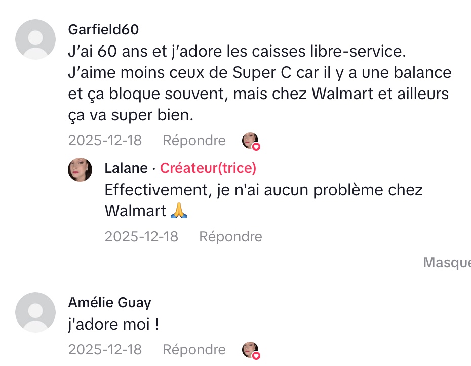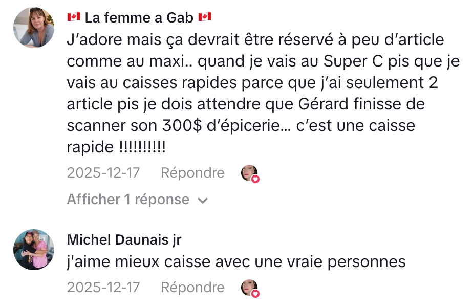 Dans son TikTok, Lalane lance une question qui résonne chez bien des consommateurs : que penser des caisses automatiques chez Walmart ou Dollarama ? Avec son ton cru et spontané, elle exprime un malaise partagé entre efficacité promise et frustration vécue. Elle se demande si son irritation vient de son âge elle a 34 ans ou d’un attachement au contact humain, celui d’une vraie caissière qui te regarde et te parle. Pour elle, ces caisses censées aller plus vite semblent souvent créer l’effet inverse : machines qui boguent, alertes répétitives et une seule employée débordée appelée à l’aide sans arrêt.