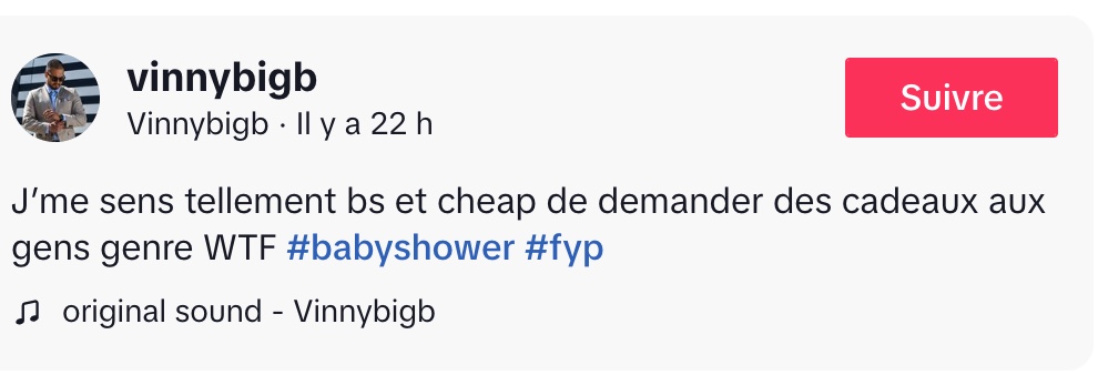 @vinnybigb J’me sens tellement bs et cheap de demander des cadeaux aux gens genre WTF #babyshower #fyp ♬ original sound – Vinnybigb