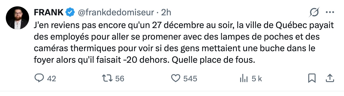 Sur les ondes du FM93, un échange a retenu l’attention alors que l’animateur s’est indigné d’une nouvelle mesure mise en place par la Ville de Québec. En période d’interdiction de feux de foyer, la municipalité déploie désormais des inspecteurs en environnement munis de caméras thermiques et d’appareils de détection spécialisés. Leur mission : repérer les résidences où des foyers sont allumés malgré les consignes en vigueur. Une annonce qui a rapidement fait réagir en studio.