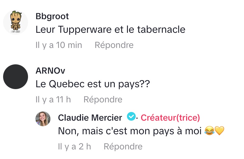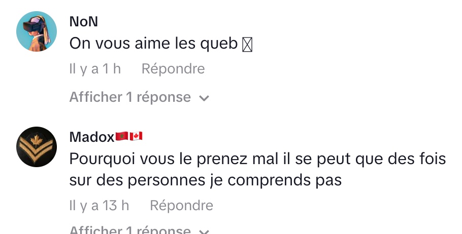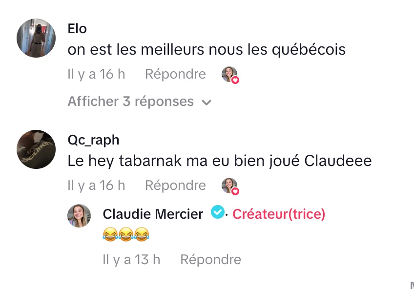 Face à cet extrait, la Tiktokeuse québécoise Claudie Mercier a rapidement répliqué dans une vidéo devenue tout aussi populaire. Elle commence par imiter les Français de façon volontairement caricaturale, reprenant un ton outrancier et des insultes pour dénoncer le mépris sous-jacent de ce type de propos. Une façon, selon elle, de mettre en lumière l’absurdité et la violence gratuite de ces jugements.