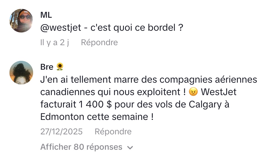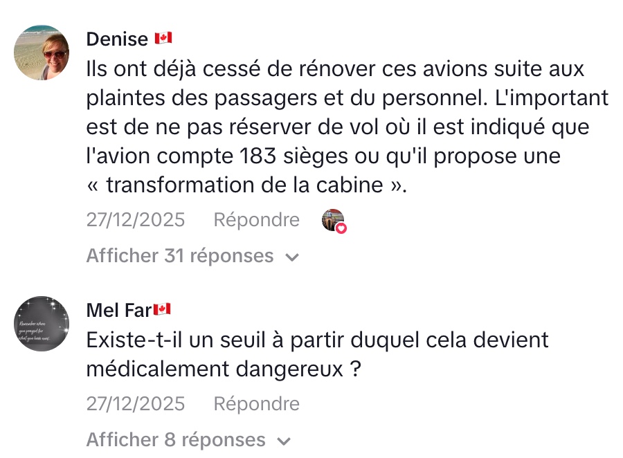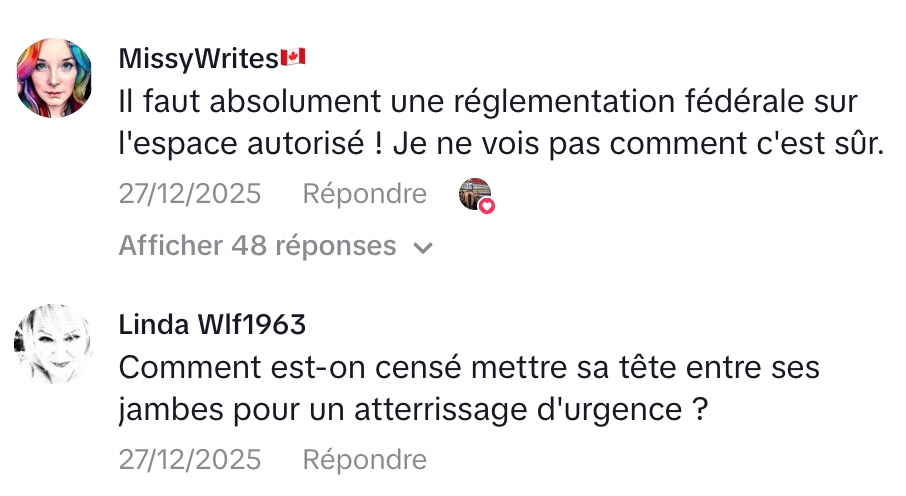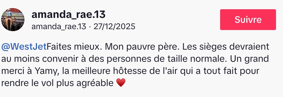 WestJet se fait critiquer de parotut après avoir modifié l’aménagement de la cabine économique de ses Boeing 737. En réduisant l’espace pour les jambes et en introduisant des sièges qui ne s’inclinent plus, la compagnie a déclenché une vive réaction des internautes. Une vidéo devenue virale faite par Amanda Rae, montrant un passager contraint de s’asseoir de travers pour placer ses jambes. Il y a aussi des inquiétudes liées au confort et à la sécurité à bord. La vidéo connait un succès monstre, et plusieurs se questionnent si on devrait pas faire une loi pour encadrer ce genre de changement.