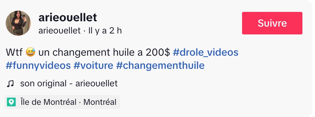 @arieouellet Wtf 😅 un changement huile a 200$ #drole_videos #funnyvideos #voiture #changementhuile ♬ son original – arieouellet