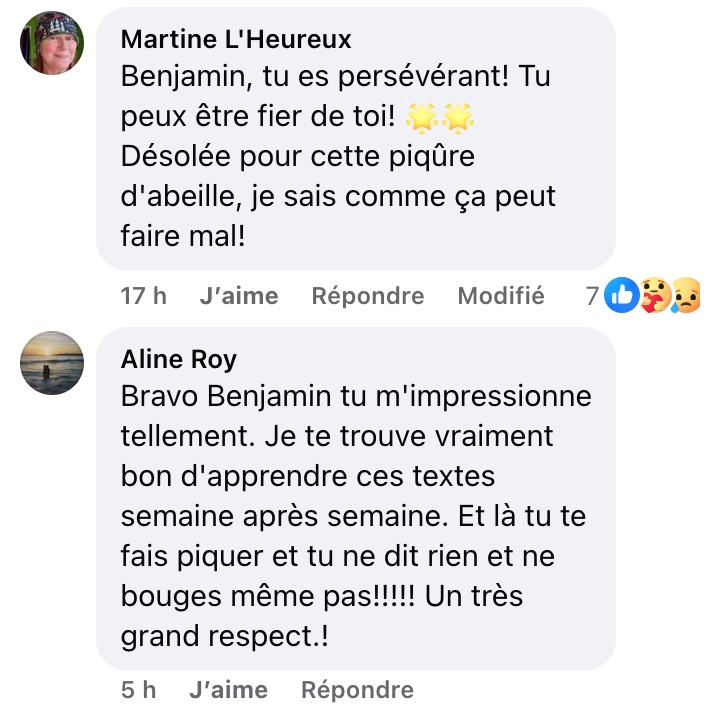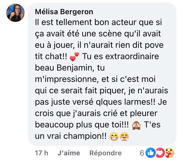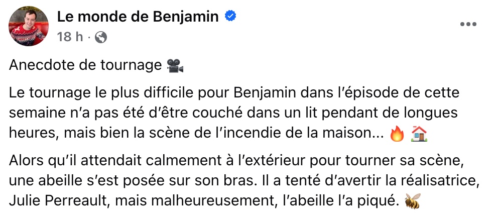 Pendant qu’il attendait calmement son tour pour tourner, une abeille s’est posée sur son bras. Benjamin a tenté de prévenir la réalisatrice Julie Perreault, mais avant même qu’elle puisse intervenir, l’abeille l’a piqué.
