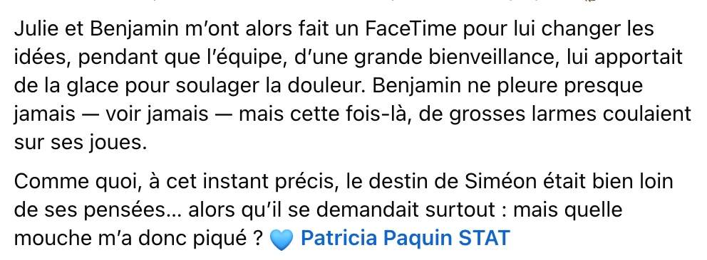 Une situation imprévue qui a causé une vive douleur au jeune comédien. Pour lui changer les idées et l’aider à traverser ce moment difficile, Julie et Benjamin ont fait un FaceTime, tandis que l’équipe, démontrant une grande bienveillance, lui apportait de la glace pour soulager la piqûre.