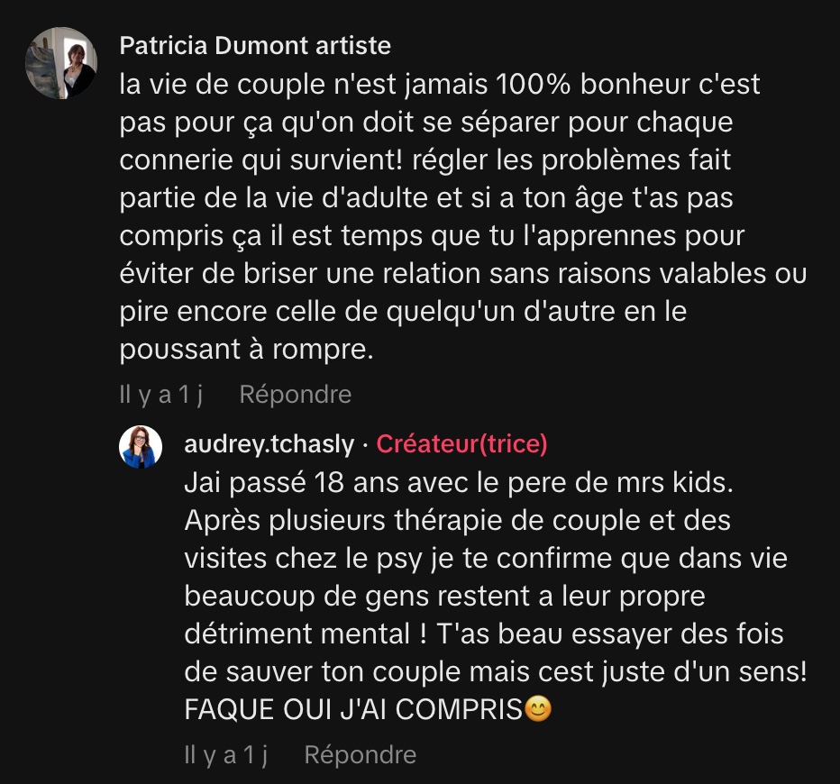Son discours, parfois excessif, fait réagir parce qu’il touche une corde sensible. Derrière l’humour et les exagérations, Audrey rappelle une chose simple : une relation ne devrait pas être une source constante de frustration.