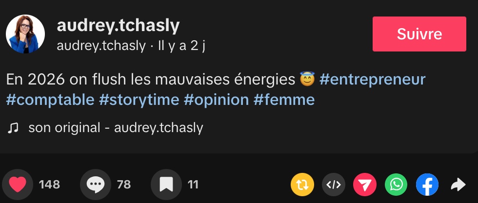 @audrey.tchasly En 2026 on flush les mauvaises énergies 😇 #entrepreneur #comptable #storytime #opinion #femme ♬ son original – audrey.tchasly