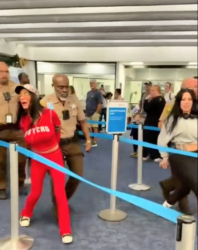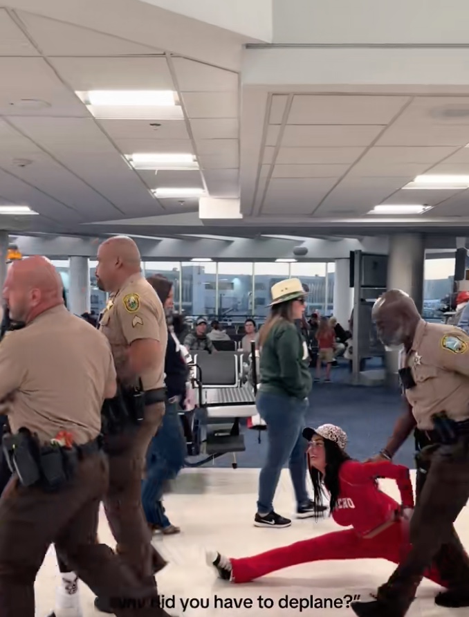 Peu après, la situation dégénère. Des agents interviennent, passent les menottes aux deux créatrices de contenu et les escortent hors de l’appareil.