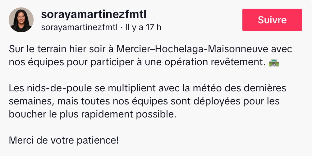 Dans une vidéo publiée sur TikTok, Soraya Martinez Ferrada aborde de front un problème qui exaspère des milliers de citoyens : l’état déplorable des routes et la prolifération des nids de poule à travers la ville. Sur le terrain, dans le secteur de Tétreault, elle tient à montrer concrètement l’ampleur du travail à accomplir et à reconnaître la frustration généralisée. Son message est clair : la situation « n’a juste pas d’allure » et personne ne fait semblant que tout va bien.