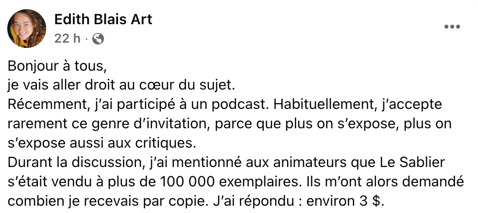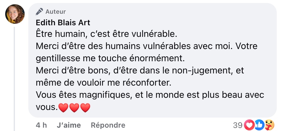 Dans sa publication, Edith Blais partage un moment de vulnérabilité et de franchise face aux critiques qu’elle a récemment reçues. Elle explique avoir participé à un podcast, ce qui n’est pas quelque chose qu’elle fait régulièrement. Pour elle, s’exposer publiquement comporte toujours un risque, car plus on partage sa vie ou ses réussites, plus on s’ouvre aux jugements des autres.