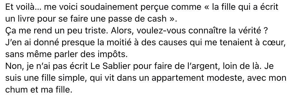 Lors de l’émission, elle a parlé de la réussite de son livre Le Sablier, qui s’est vendu à plus de 100 000 exemplaires. Interrogée sur les gains qu’elle en tirait, elle a révélé qu’elle recevait environ trois dollars par copie. Cette réponse, pourtant honnête, a conduit certains à la percevoir de manière négative, comme si elle avait écrit son livre uniquement pour l’argent.