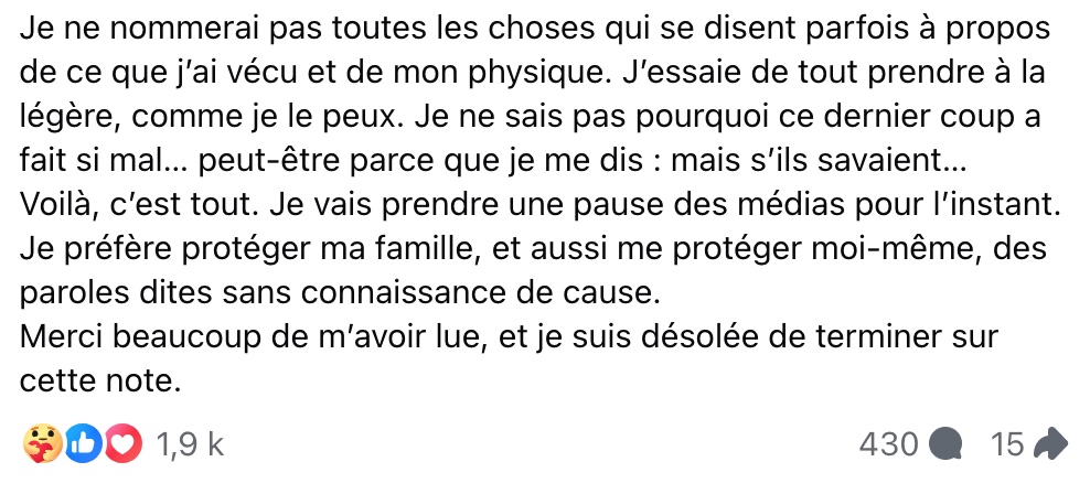Pour se protéger et protéger sa famille, Edith annonce qu’elle va faire une pause des médias. Elle termine sa publication sur une note de gratitude envers ceux qui la lisent, tout en exprimant son regret de devoir partager une telle situation douloureuse.