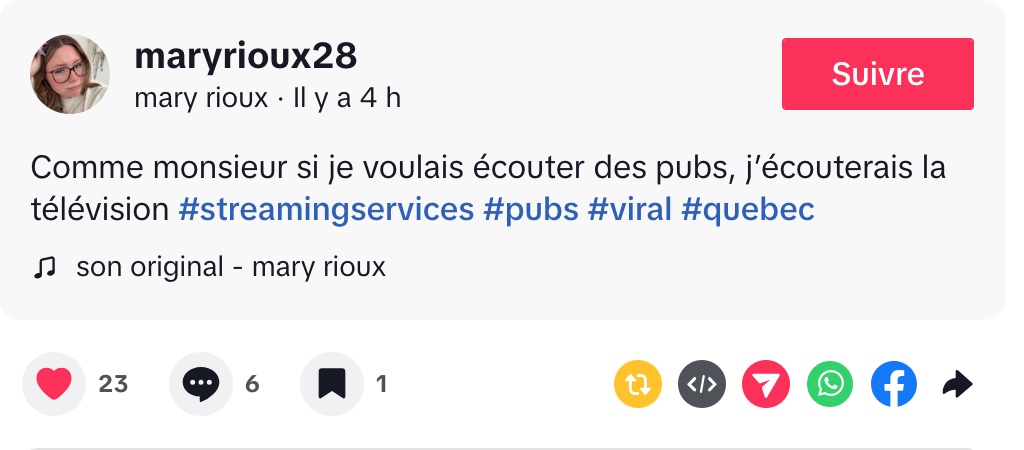 @maryrioux28 Comme monsieur si je voulais écouter des pubs, j’écouterais la télévision #streamingservices #pubs #viral #quebec ♬ son original – mary rioux