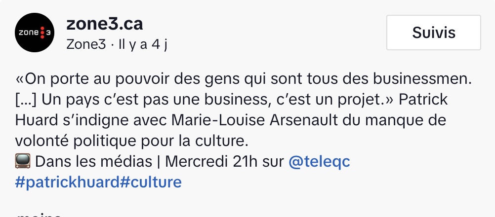 @zone3.ca «On porte au pouvoir des gens qui sont tous des businessmen. […] Un pays c’est pas une business, c’est un projet.» Patrick Huard s’indigne avec Marie-Louise Arsenault du manque de volonté politique pour la culture. 📺 Dans les médias | Mercredi 21h sur @teleqc #patrickhuard#culture ♬ son original – Zone3
