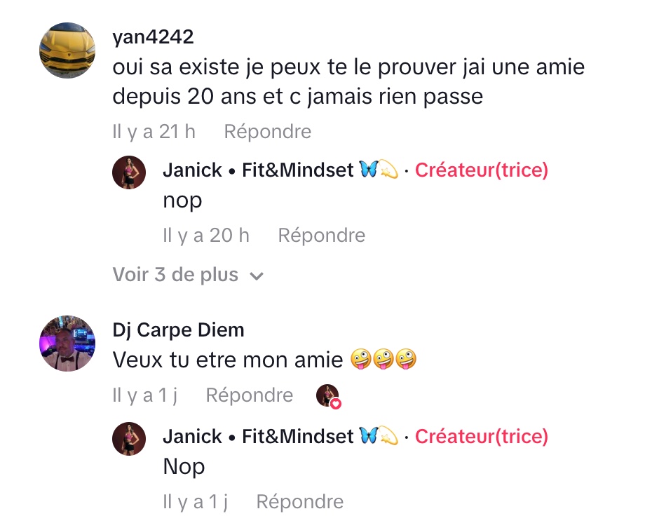 Dans une vidéo TikTok qui fait beaucoup réagir, Janick remet frontalement en question l’idée de l’amitié entre un homme hétérosexuel et une femme hétérosexuelle. Sans détour ni filtre, elle affirme ne pas croire qu’une relation strictement amicale puisse exister sans aucune forme d’attirance, que ce soit physique, émotionnelle ou implicite.