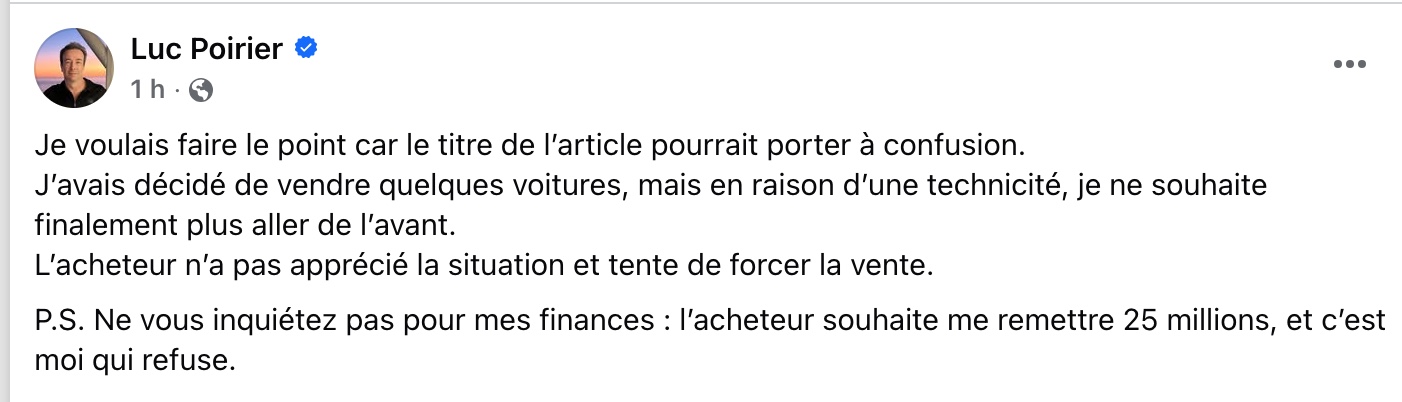 Dans sa mise au point, Luc Poirier explique qu’il avait effectivement pris la décision de vendre quelques véhicules de sa collection, incluant des Ferrari de grande valeur. Toutefois, une technicité liée à la transaction l’a amené à revoir sa position et à se retirer du processus de vente. Une décision légitime, selon lui, mais qui n’aurait pas été bien accueillie par l’acheteur potentiel.