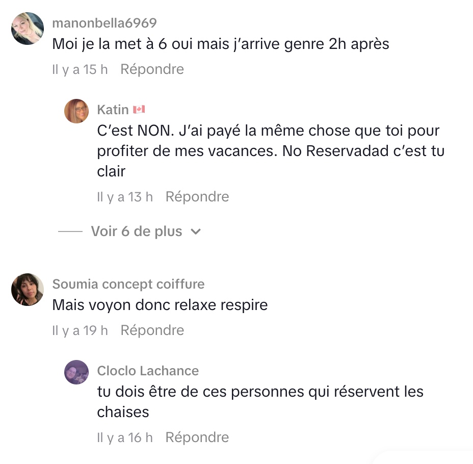 Selon elle, la situation est simple : le resort est plein, les chaises sont occupées… en apparence seulement. Des serviettes sont étalées depuis des heures, mais leurs propriétaires demeurent introuvables. Pour Mère Ordinaire, cette habitude est non seulement irrespectueuse, mais totalement contraire aux règles affichées sur place, où il est clairement indiqué « no reservation ».