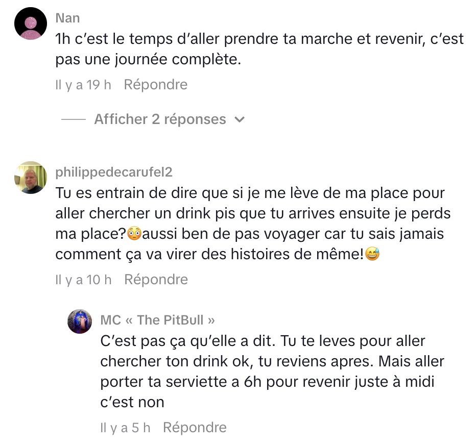 Avec son franc-parler habituel, elle ironise : à moins de laisser son bébé ou son foie sur la chaise, une simple serviette ne devrait jamais suffire à la réserver. Elle pousse même la réflexion plus loin en rappelant qu’une serviette perdue peut coûter cher, évoquant le fameux 40 $ facturé par les hôtels.
