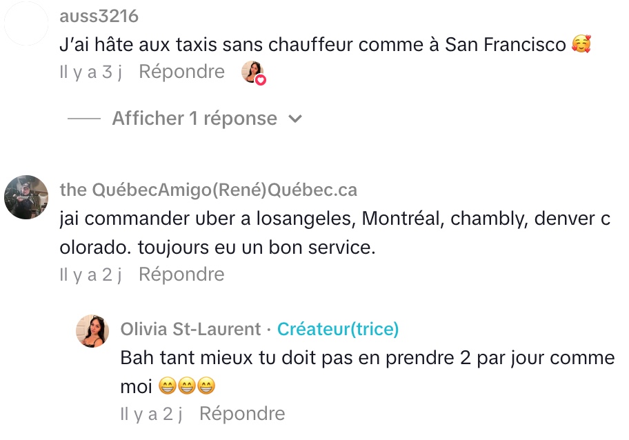 Au final, Olivia confesse qu’elle ne se sent sereine ni dans un Uber ni dans un taxi. Cependant, elle insiste : avec les taxis, le risque est bien plus élevé, et pour elle, les expériences négatives sont trop nombreuses pour continuer à les utiliser. Sa critique met en lumière les problèmes de sécurité, de transparence et de fiabilité qui persistent dans le service de transport traditionnel.