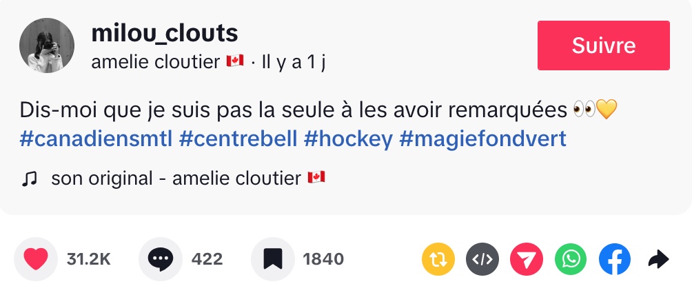 @milou_clouts Dis-moi que je suis pas la seule à les avoir remarquées 👀💛 #canadiensmtl #centrebell #hockey #magiefondvert ♬ son original – amelie cloutier 🇨🇦