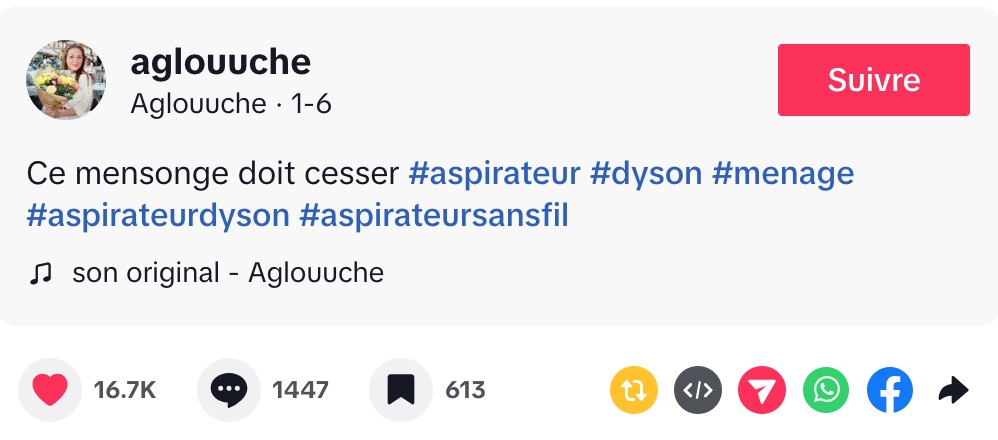 Dans une vidéo TikTok devenue virale, la créatrice Aglou vide son sac au sujet des aspirateurs Dyson sans fil, dénonçant ce qu’elle considère comme un manque d’honnêteté autour de leur réelle performance à long terme. D’entrée de jeu, elle interpelle les consommateurs et les créateurs de contenu en demandant qu’on arrête de « faire semblant » avec ces appareils souvent présentés comme miraculeux. Selon elle, si tout avait été dit dès le départ, elle n’aurait tout simplement jamais passé à la caisse.