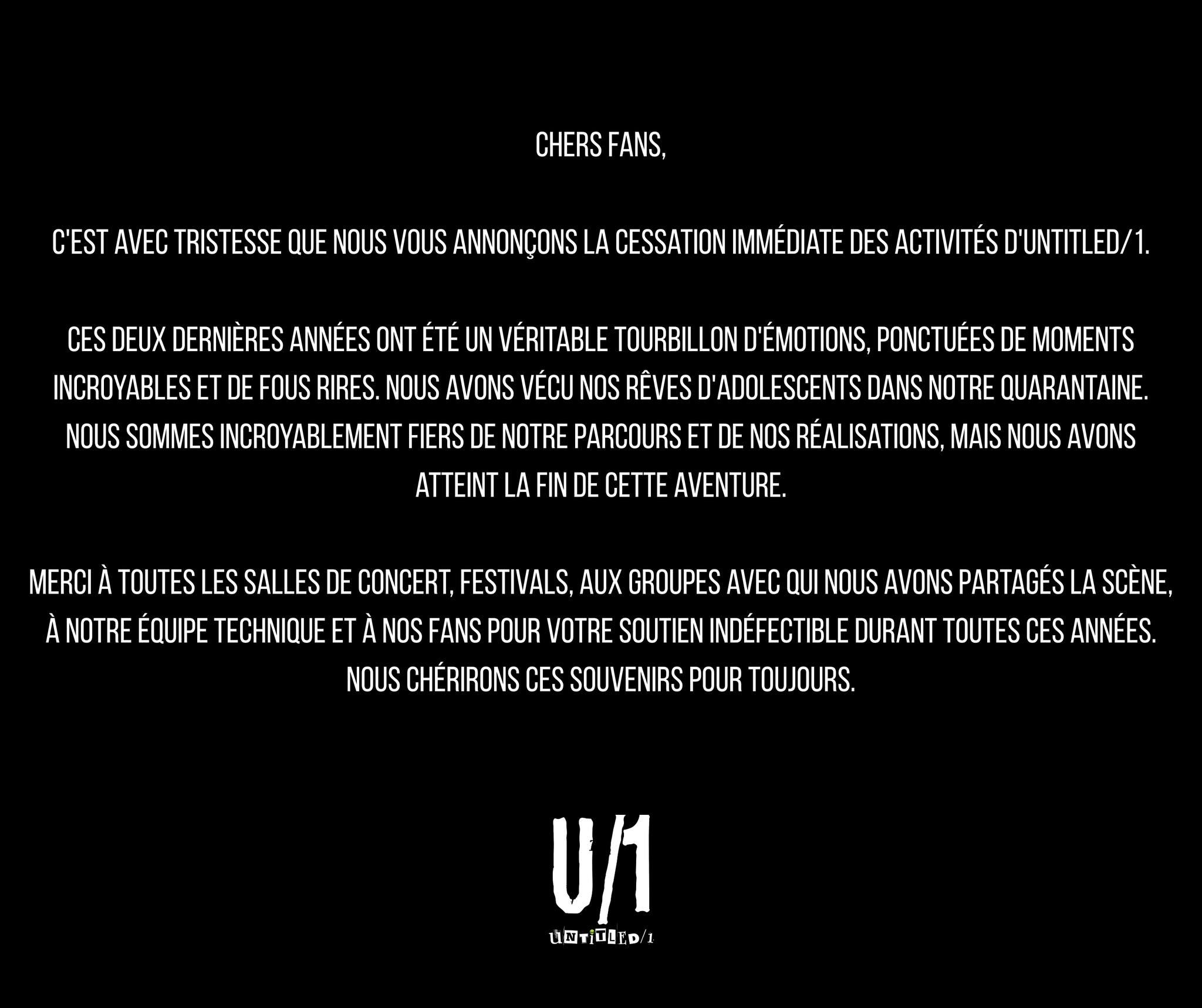 Malgré cet élan, le groupe choisit aujourd’hui de tirer sa révérence. Dans un message empreint de gratitude, les membres remercient les fans et les artisans du milieu. Si cette page se tourne, l’empreinte d’Untitled/1 demeure bien vivante, et plusieurs espèrent déjà revoir Iza Desjardins briller dans de futurs projets. (via Conneries QC)