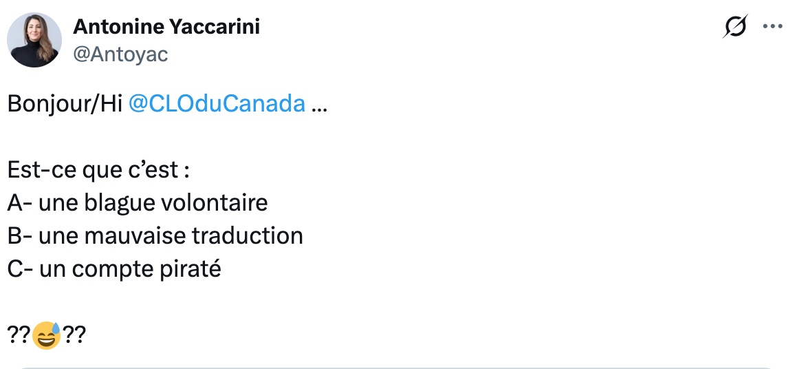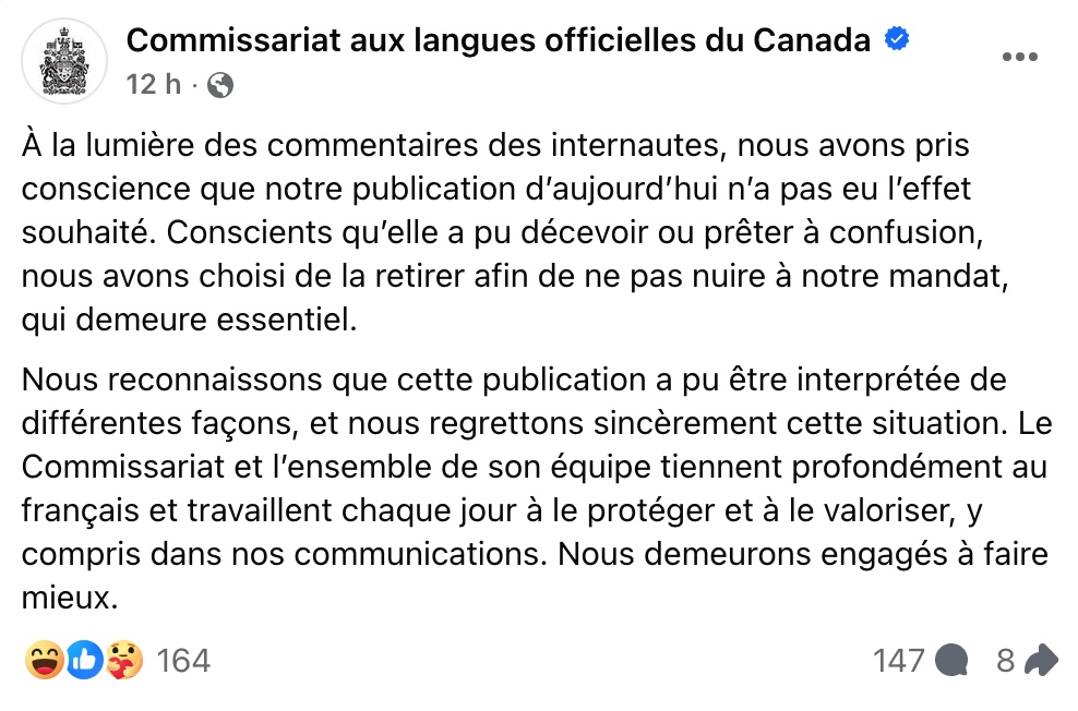 L’organisme a aussi souligné qu’il regrettait sincèrement la situation et qu’il comprenait que le visuel et le message aient pu être interprétés de différentes façons. Il a tenu à rappeler son attachement profond au français et à la protection des langues officielles, précisant que cet engagement guide l’ensemble de son travail et de ses communications. Enfin, le Commissariat a assuré vouloir tirer des leçons de cet épisode et s’est engagé à faire preuve de plus de vigilance à l’avenir.