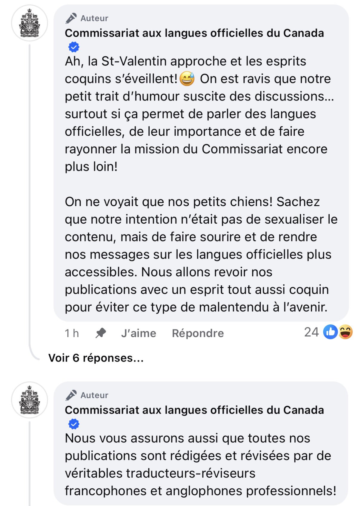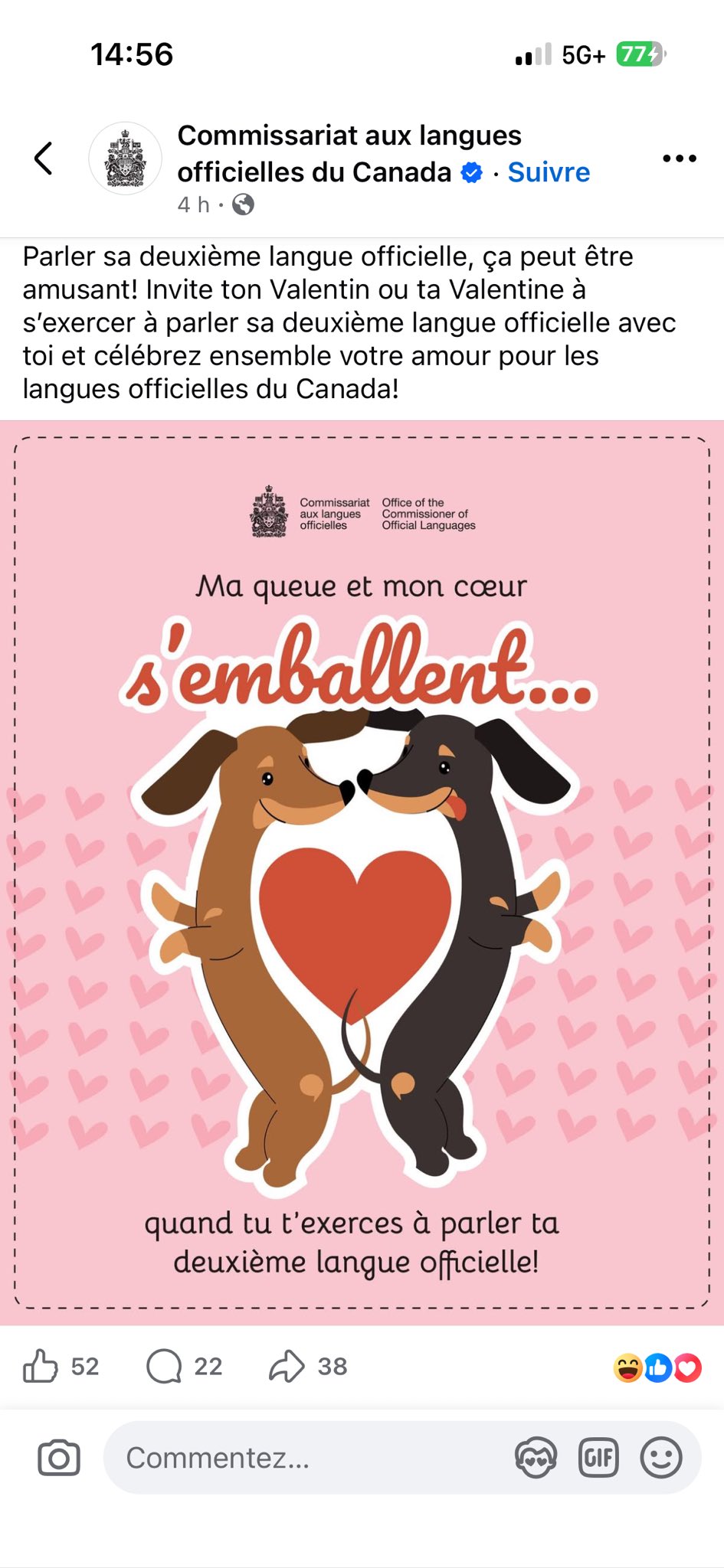 Un peu avant la Saint-Valentin, le Commissariat aux langues officielles a voulu proposer une façon originale d’encourager les Canadiens à pratiquer l’une des deux langues officielles, en publiant une image sur sa page Facebook. La publication, jugée maladroite par plusieurs internautes, a rapidement suscité des réactions.