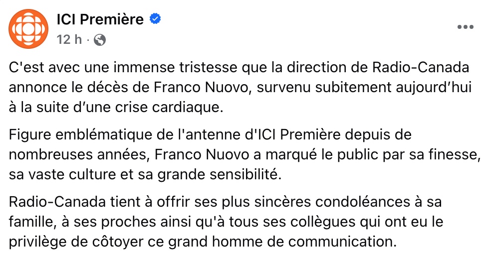 Dans son message, Radio-Canada a tenu à transmettre ses plus sincères condoléances à la famille de Franco Nuovo, à ses proches ainsi qu’à ses collègues, nombreux à avoir eu la chance de travailler à ses côtés. Son départ laisse un vide immense sur les ondes et dans le cœur de ceux qui l’ont connu et admiré.