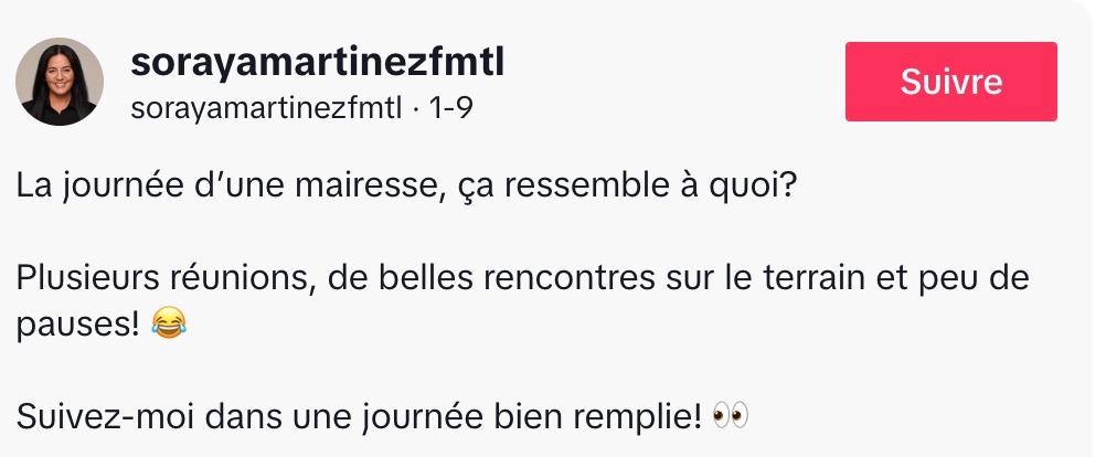 Sur TikTok, la mairesse de Montréal propose un rare aperçu de son quotidien à travers une vidéo authentique et rythmée. Publiée avec le message : « La journée d’une mairesse, ça ressemble à quoi? Plusieurs réunions, de belles rencontres sur le terrain et peu de pauses! », la capsule plonge les internautes dans une journée bien remplie, à la fois politique et personnelle.