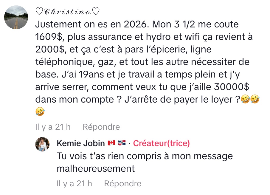 Dans une vidéo publiée sur TikTok, Kemie livre un discours sans détour sur l’argent, la discipline financière et les opportunités de la nouvelle génération. Selon elle, en 2026, ne pas avoir au moins 30 000 $ dans son compte bancaire est le signe qu’on n’a pas encore « compris la game ». Un message choc, assumé, qui vise à provoquer une prise de conscience chez ceux et celles qui vivent encore « paye par paye ».