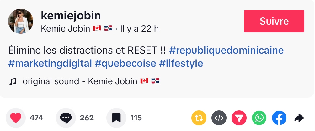 @kemiejobin Élimine les distractions et RESET !! #republiquedominicaine #marketingdigital #quebecoise #lifestyle ♬ original sound – Kemie Jobin 🇨🇦 🇩🇴