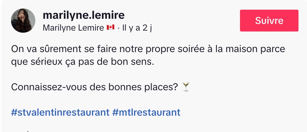 @marilyne.lemire On va sûrement se faire notre propre soirée à la maison parce que sérieux ça pas de bon sens. Connaissez-vous des bonnes places? 🍸 #stvalentinrestaurant #mtlrestaurant ♬ son original – Marilyne Lemire 🇨🇦