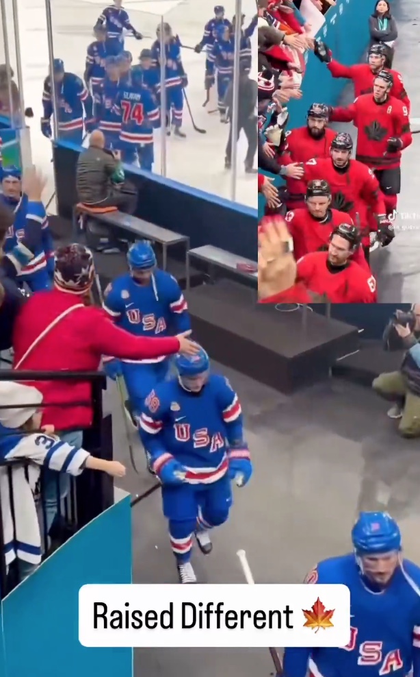 En parallèle, la vidéo montre l’équipe olympique canadienne qui, à l’inverse, prend le temps de serrer la main des partisans en se dirigeant vers leur vestiaire. Ces gestes de reconnaissance sont accueillis par des applaudissements et des sourires, renforçant l’idée que le respect et l’interaction avec le public font partie de l’expérience sportive.