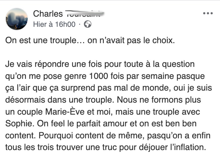 Dans sa publication Facebook devenue virale, Charles explique sans détour pourquoi lui et Marie-Ève ont décidé de transformer leur couple en trouple avec l’arrivée de Sophie. Dès les premières lignes, le ton est donné : il ne s’agit pas d’un coup de tête ni d’une provocation, mais d’une réponse assumée à une réalité économique qui pèse lourd sur le quotidien. Selon lui, l’inflation a rendu la vie à deux presque intenable, entre l’épicerie qui explose, les maisons inaccessibles, les factures d’Hydro qui montent sans cesse, les assurances automobiles en hausse et les sorties culturelles devenues hors de prix.