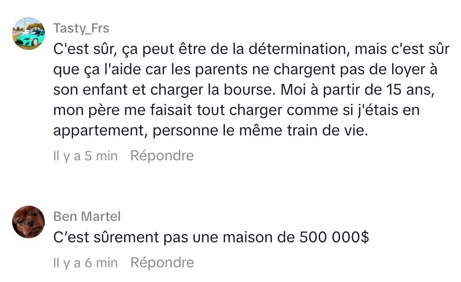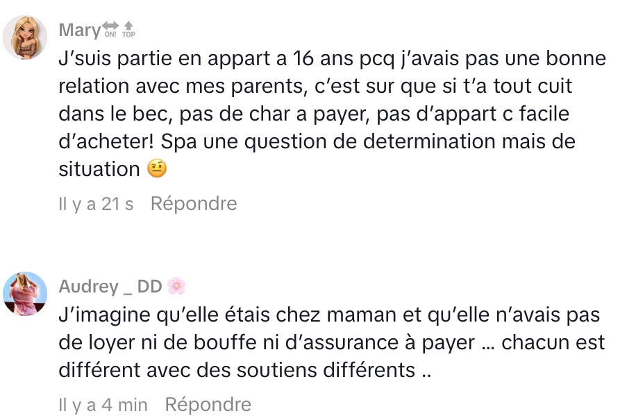 Dans son TikTok, Cathy livre un discours qui fait réagir parce qu’il bouscule un sentiment très répandu : celui de l’impossibilité d’accéder à la propriété. Devant sa fille, elle raconte avec fierté que celle-ci a acheté sa première maison à seulement 19 ans. Un âge qui choque, intrigue et, pour certains, irrite. Cathy ne mâche pas ses mots : elle dit être tannée d’entendre les gens se plaindre qu’ils n’ont pas d’argent et qu’ils ne pourront jamais devenir propriétaires.