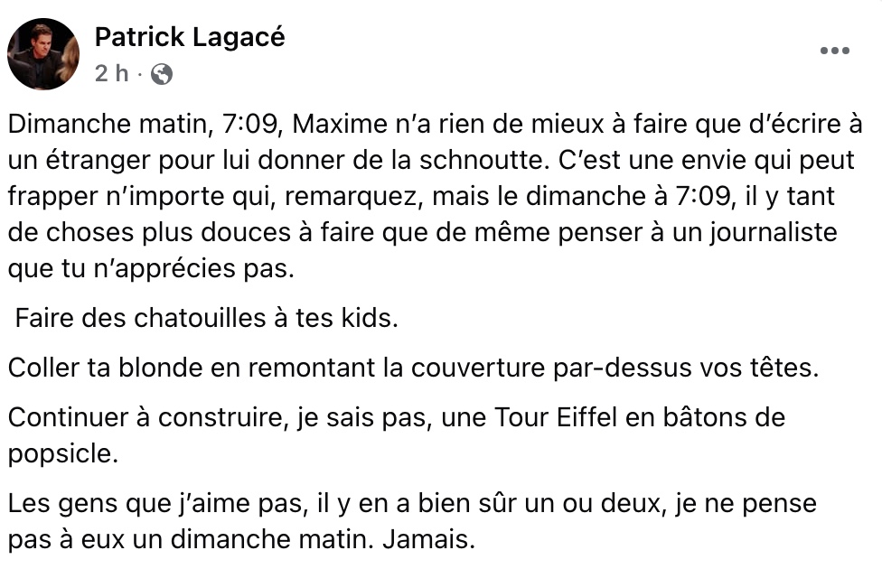 La réponse de Patrick Lagacé à un message privé insultant a rapidement attiré l’attention, non pas par sa virulence, mais par l’ironie calme et réfléchie qui la traverse. Interpellé par un certain Maxim qui lui a écrit « Sérieux t’es mauvais en tbk », le journaliste a choisi de rendre l’échange public en publiant la photo de l’expéditeur et son message, accompagné d’un texte à la fois cinglant et presque mélancolique.