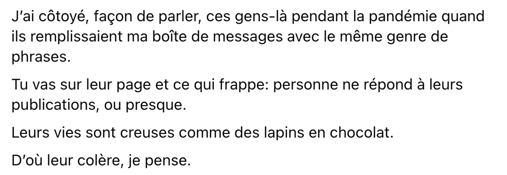 Sans jamais tomber dans l’attaque personnelle, le chroniqueur élargit le propos. Il rappelle avoir connu ce type de messages pendant la pandémie, période où la colère et la frustration semblaient déborder dans les boîtes de réception.