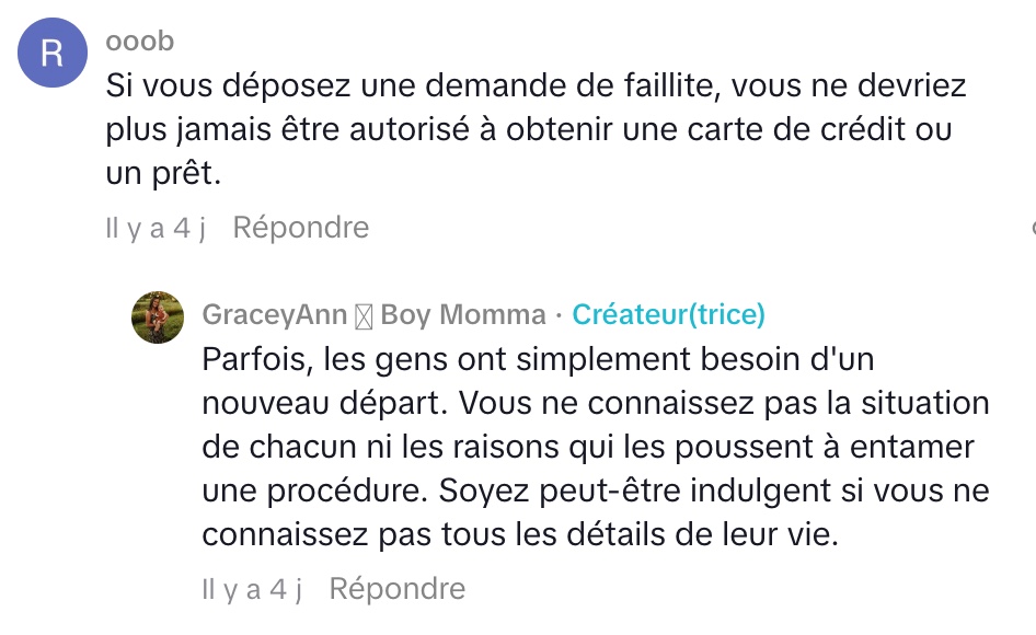 Son témoignage illustre à la fois les avantages et les conséquences de la faillite, souvent perçue à tort comme une solution rapide, alors qu’elle laisse des traces durables, notamment sur la cote de crédit. (via Conneries QC)