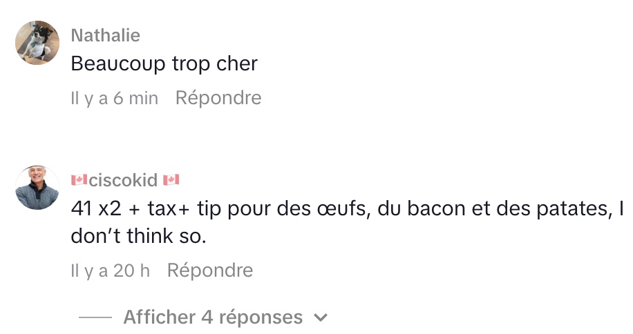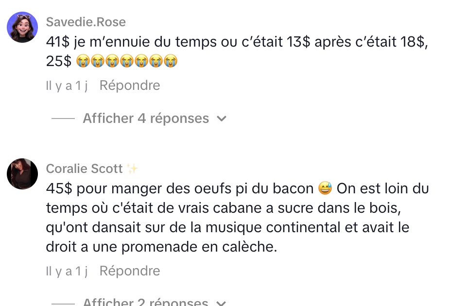 Cependant, dans les commentaires, plusieurs internautes ne partagent pas son enthousiasme. Pour eux, 41 $ demeure excessif, peu importe la quantité ou la variété de plats offerts. Certains estiment que la cabane à sucre doit rester une sortie familiale abordable, tandis que d’autres dénoncent une « expérience urbaine » qui s’éloigne de l’esprit authentique des érablières en région.