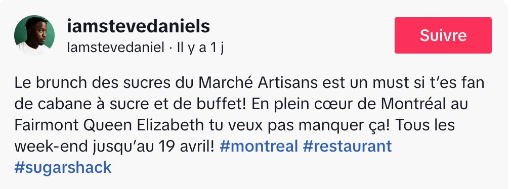 @iamstevedaniels Le brunch des sucres du Marché Artisans est un must si t’es fan de cabane à sucre et de buffet! En plein cœur de Montréal au Fairmont Queen Elizabeth tu veux pas manquer ça! Tous les week-end jusqu’au 19 avril! #montreal #restaurant #sugarshack ♬ original sound – Iamstevedaniel