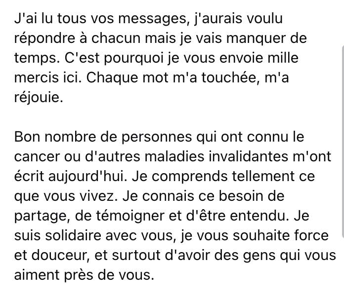Son message prend aussi une dimension plus intime lorsqu’elle s’adresse aux personnes vivant avec le cancer ou d’autres maladies invalidantes. Elle dit comprendre leur besoin de partager et d’être entendues, exprimant sa solidarité et leur souhaitant force, douceur et amour.