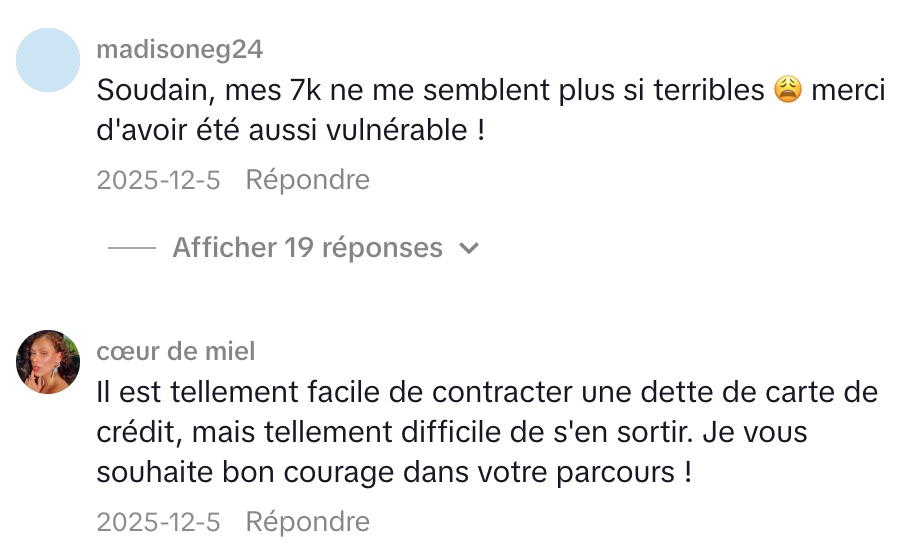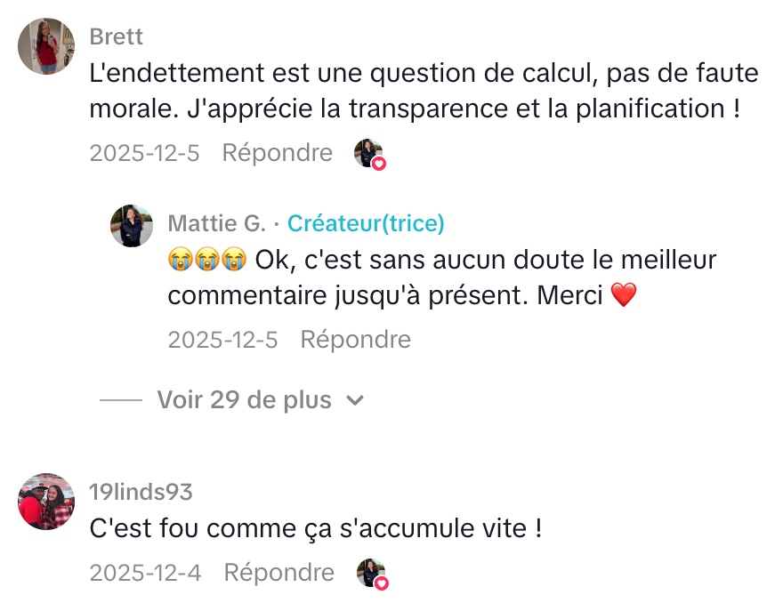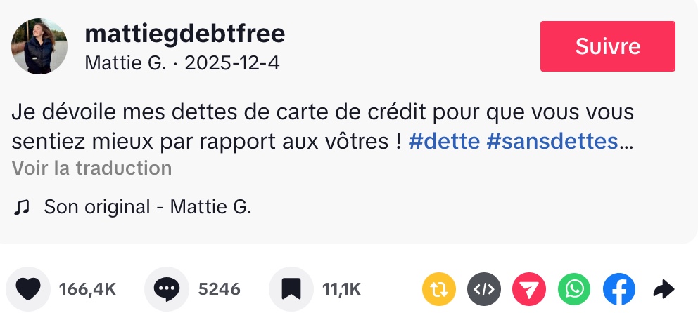 Même si ce chiffre peut sembler impressionnant, Mattie insiste sur un point : elle ne veut plus laisser la peur ou la honte la contrôler. Selon elle, les dettes sont souvent entourées de tabous et peuvent donner un sentiment d’isolement. Elle encourage donc les gens à regarder leur situation financière en face, sans jugement. Pour elle, ce montant n’est qu’un chiffre, et c’est le point de départ d’un long chemin vers l’indépendance financière. Elle avoue être à la fois nerveuse et enthousiaste de partager cette aventure avec les internautes.