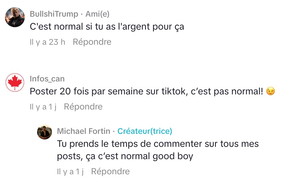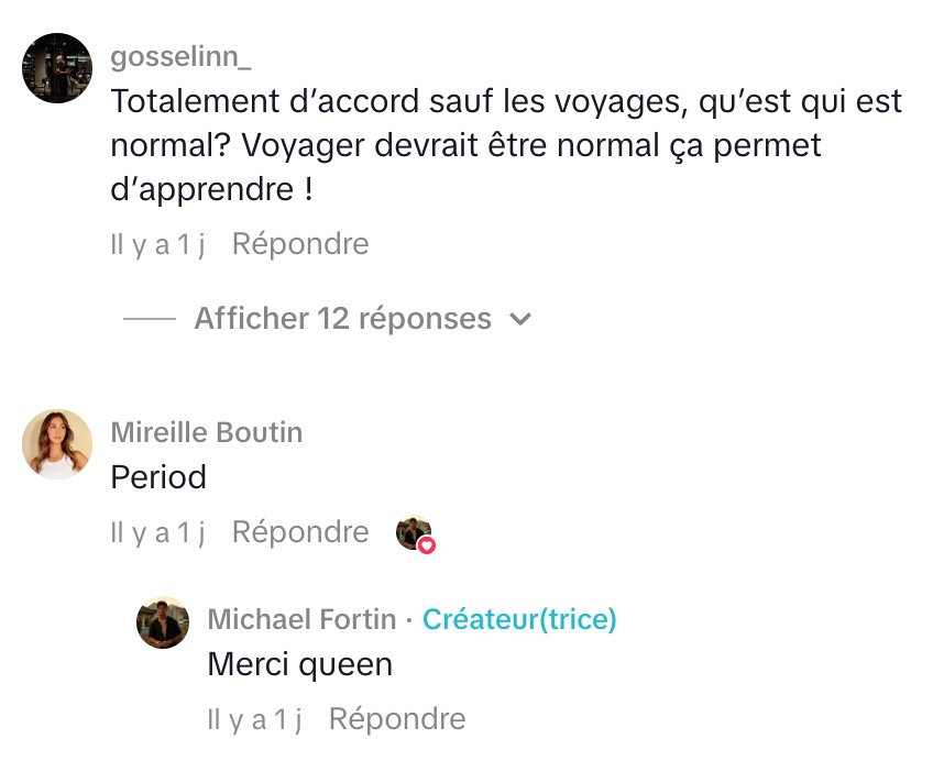Dans une vidéo publiée sur TikTok, Michael aborde avec franchise le phénomène de comparaison constante sur les réseaux sociaux. Selon lui, plusieurs habitudes qui semblent aujourd’hui banales sur internet ne représentent pourtant pas la réalité de la majorité des gens. Il rappelle d’abord que sortir au restaurant plusieurs fois par semaine ou partir en voyage trois ou quatre fois par année n’est pas quelque chose de normal pour la plupart des personnes. Pourtant, à voir défiler les publications sur les plateformes sociales, on pourrait facilement croire que ce mode de vie est devenu la norme.