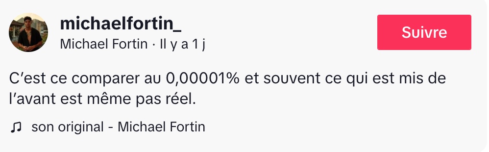 @michaelfortin_C’est ce comparer au 0,00001% et souvent ce qui est mis de l’avant est même pas réel.♬ son original – Michael Fortin