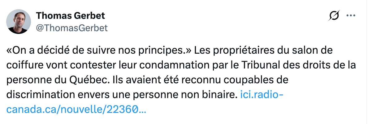 La saga entourant la poursuite de 500 $ contre un salon de coiffure québécois continue de susciter de vives réactions. À l’origine de l’affaire se trouve Alexe Frédéric Migneault, une personne non binaire qui avait déposé une plainte après avoir constaté que le système de réservation du salon proposait uniquement les options « coupe homme » ou « coupe femme ». L’affaire s’est finalement retrouvée devant le Tribunal des droits de la personne, qui a accordé 500 $ de dommages.