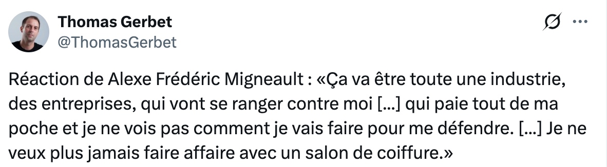 Depuis, le débat dépasse largement la somme en jeu. Alexe Frédéric Migneault s’est récemment exprimé publiquement sur la décision du salon de porter la cause en appel. « Ça va être toute une industrie, des entreprises, qui vont se ranger contre moi […] qui paie tout de ma poche et je ne vois pas comment je vais faire pour me défendre », a-t-il déclaré. Découragé par la tournure des événements, il a aussi affirmé : « Je ne veux plus jamais faire affaire avec un salon de coiffure. »