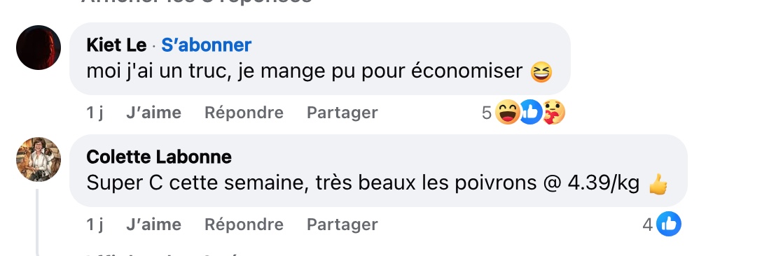 D’autres préfèrent en rire. « Moi j’ai un truc : je mange pu pour économiser », plaisante un internaute. Une autre personne rappelle aussi que les poivrons sont actuellement beaucoup moins chers dans certaines grandes surfaces, mentionnant par exemple une promotion à 4,39 $ le kilo chez Super C cette semaine.